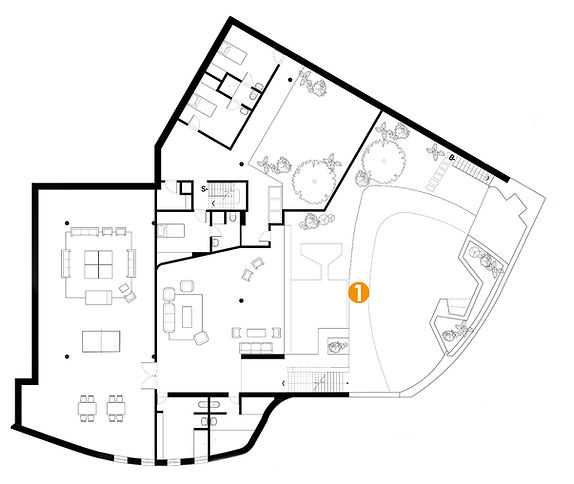 La actividad social se centra en el gran salón, alrededor del cual se alternan espacios cubiertos y descubiertos, generando una variedad de relaciones interior-exterior que siempre tienen como fondo la visual sobre la ciudad. Los espacios sociales descienden hacia el nivel de la piscina, manteniendo siempre la visual de la ciudad, así como el aislamiento total respecto de los servicios y las alcobas.